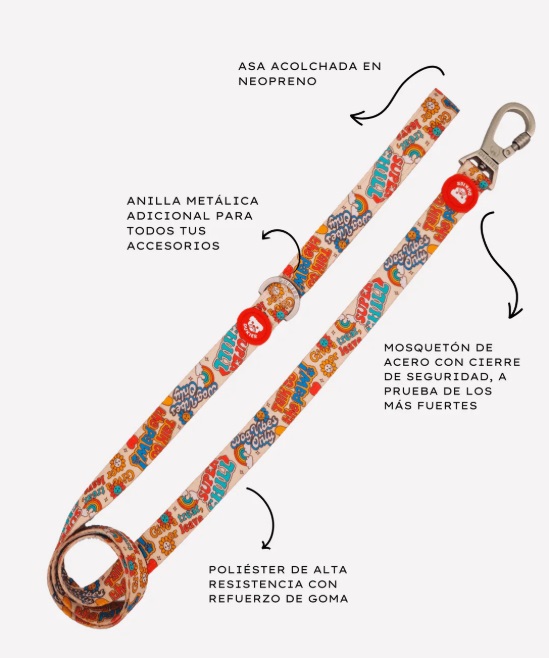 El mosquetón que incluye es duro de roer, tu perro no se escapará ni aunque quiera. Con diseños chulis a cada lado para que seáis la envidia del parque. Esta correa tampoco se olvida de ti, y hemos cubierto el asa con neopreno acolchado para que no te hagas daño.